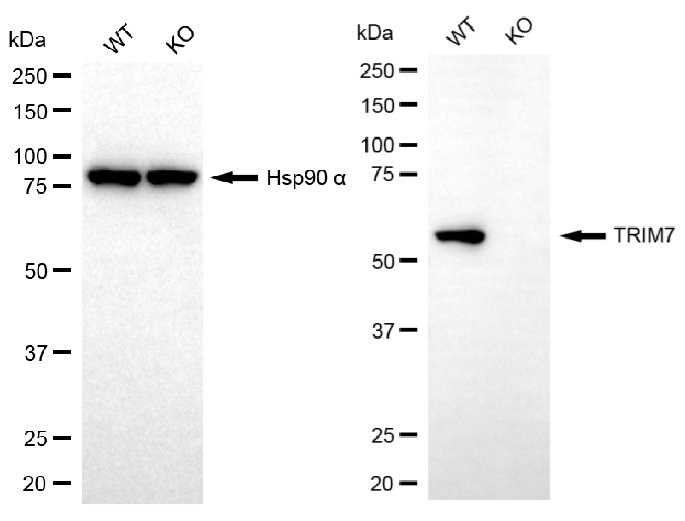 Western blotting analysis using TRIM7 antibody. TRIM7 expression in wild type (WT) and TRIM7 knockout (KO) HeLa cells with 20 μg of total cell lysates. Hsp90 α serves as a loading control. The blot was incubated with TRIM7 antibody and HRP-conjugated goat anti-mouse secondary antibody respectively.