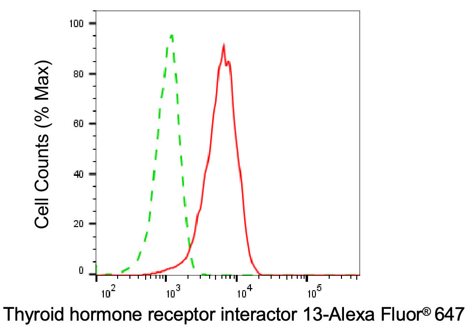 Flow cytometric analysis of Thyroid hormone receptor interactor 13 expression in HAP-1 cells using Thyroid hormone receptor interactor 13 antibody. Green, isotype control; red, Thyroid hormone receptor interactor 13.