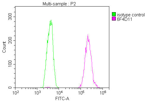 Overlay Peak curve showing U251 cells stained with CSB-MA860355A0m (red line) at 1:100. The cells were incubated in 10% normal goat serum to block non-specific protein-protein interactions followed by the antibody (1μg/1*106cells) for 1h at 4°C. The secondary antibody used was FITC-conjugated Goat Anti-Mouse IgG(H+L) at 1/100 dilution for 30min at 4°C. Isotype control antibody (green line) was mouse IgG1 (1μg/1*106cells) used under the same conditions. Acquisition of >10,000 events was performed.