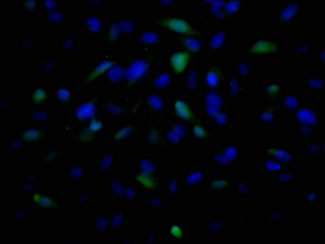 Immunofluorescence staining of U251 cells with CSB-MA860355A0m at 1:100, counter-stained with DAPI. The cells were fixed in 4% formaldehyde and blocked in 10% normal Goat Serum. The cells were incubated with the antibody overnight at 4°C. Nuclear DNA was labeled in blue with DAPI. The secondary antibody was FITC-conjugated AffiniPure Goat Anti-Mouse IgG (H+L).