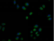 Immunofluorescence staining of HeLa cells with CSB-MA025747A0m at 1:50, counter-stained with DAPI. The cells were fixed in 4% formaldehyde and blocked in 10% normal Goat Serum. The cells were then incubated with the antibody overnight at 4°C. Nuclear DNA was labeled in blue with DAPI. The secondary antibody was FITC-conjugated AffiniPure Goat Anti-Mouse IgG (H+L).