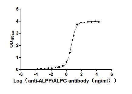 Measured by its binding ability in a functional ELISA. Immobilized Human ALPP at 2 μg/ml can bind Anti-ALPP/ALPG recombinant antibody (CSB-RA001633MA1HU). The EC50 is 4.478-5.236 ng/mL. Biological Activity Assay -