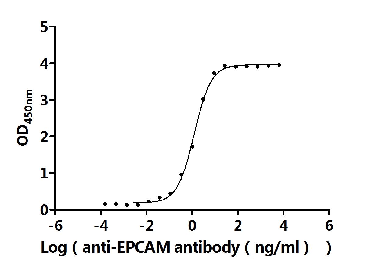 Measured by its binding ability in a functional ELISA. Immobilized Human EPCAM at 2 μg/ml can bind Anti-EPCAM recombinant antibody (CSB-RA007717MA2HU). The EC50 is 1.098-1.401 ng/mL. Biological Activity Assay -