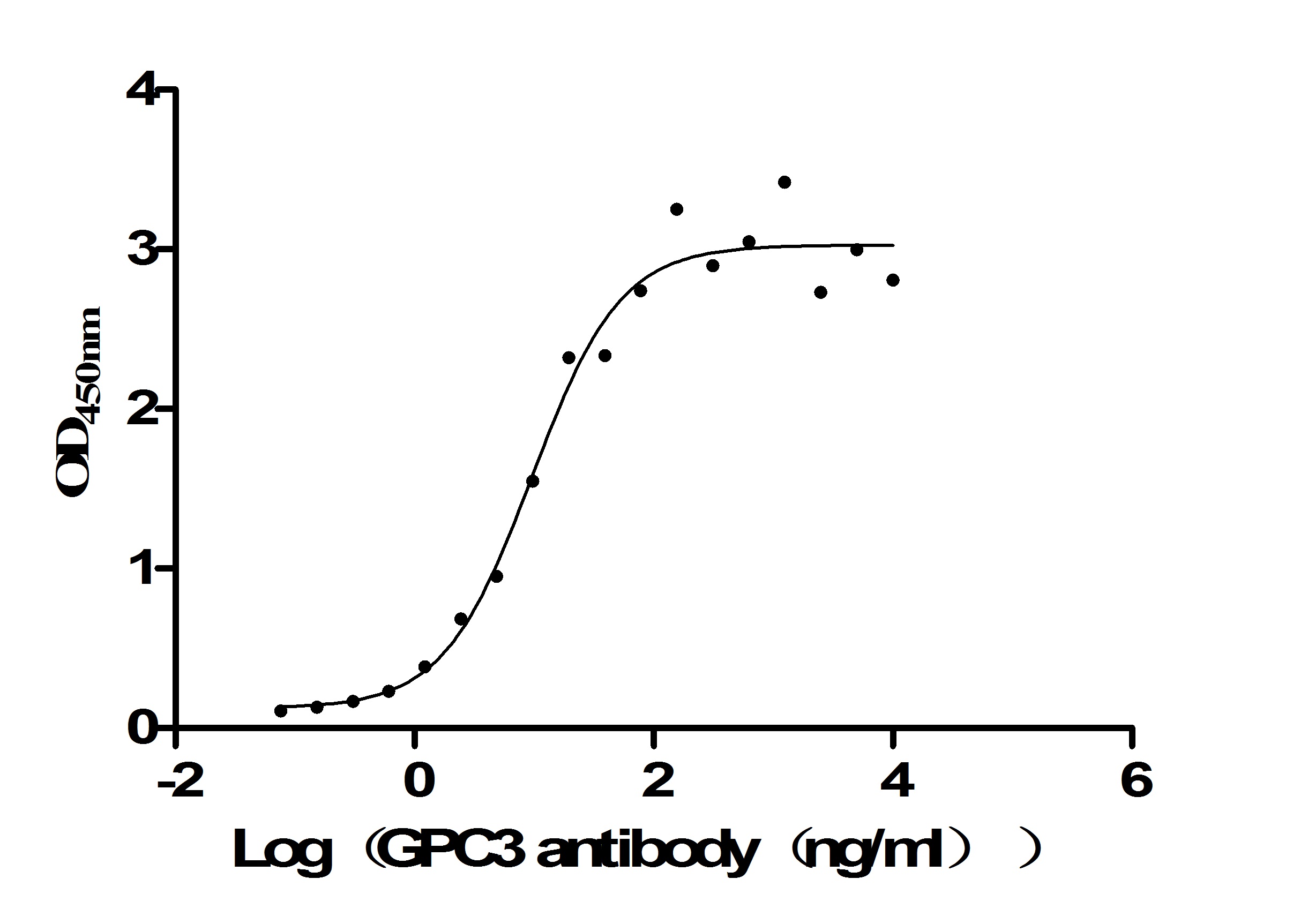 The gene fragment corresponding to amino acids 25-559 of the human glypican-3 (GPC3) is expressed in mammalian cells and then is fused with the 6xHis-Myc-tag at the N-terminus. The resulting protein has been validated to be an active protein in the functional ELISA. It can bind to the anti-GPC3 antibody, and the EC50 is 4.739-7.092 ng/ml. Its purity is greater than 92.4% measured by SDS-PAGE. On the gel, this protein migrated to the molecular weight band of 70-90 kDa. The endotoxin of this protein is less than 1.0 EU/ug determined by the LAL method. GPC3 is a cell-surface glycoprotein and has important functions in signaling including cell growth, embryogenesis, and differentiation. GPC3 upregulation has been found in hepatocellular carcinoma (HCC), while GPC3 is absent in normal and cirrhotic liver. GPC3 has recently been identified as a potential hepatocellular carcinoma (HCC) diagnostic and therapeutic target.