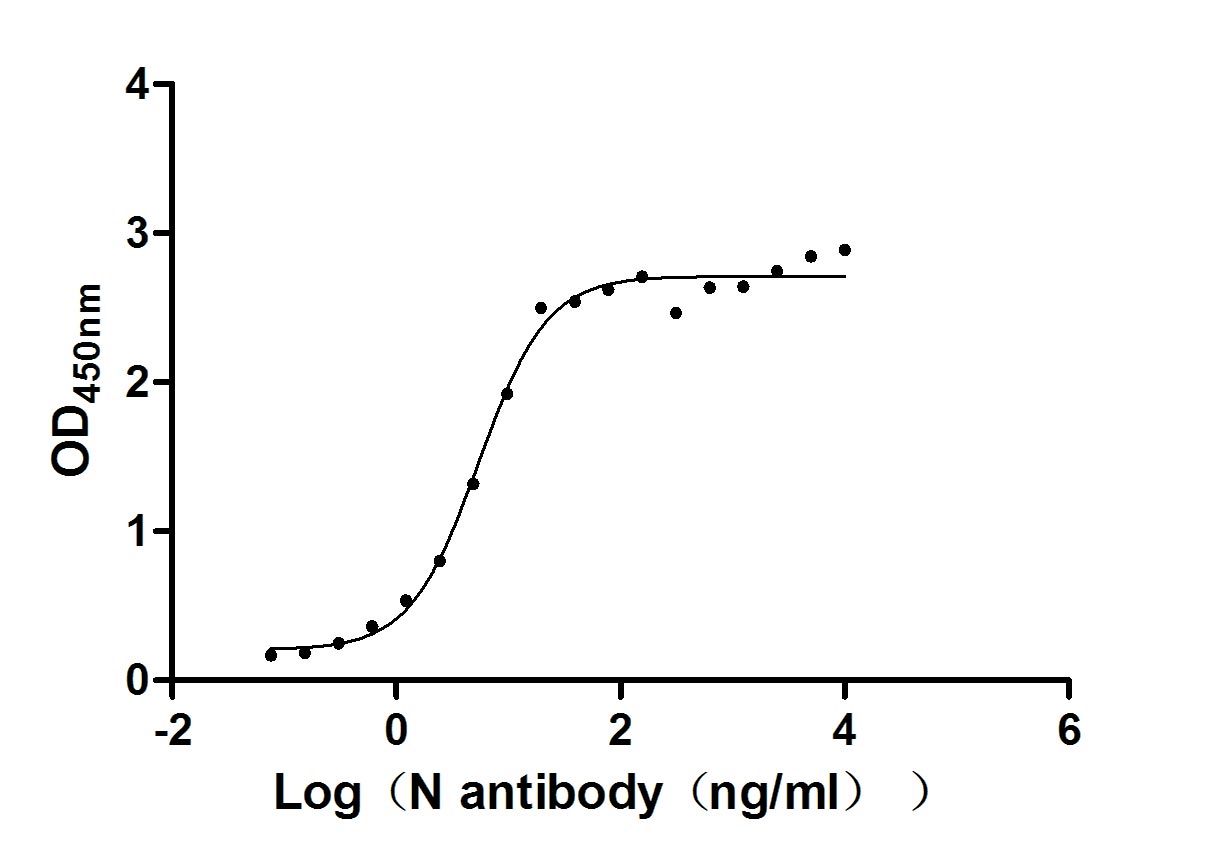 Measured by its binding ability in a functional ELISA. Immobilized N (CSB-EP3325GMY(M5)) at 2 μg/ml can bind N Mouse Monoclonal Antibody(CSB-MA33255A2m), the EC50 of N Mouse Monoclonal Antibody is 4.620-6.350 ng/ml. Biological Activity Assay -