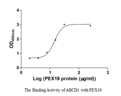 Activity Measured by its binding ability in a functional ELISA. Immobilized ABCD1 at 5 μg/ml can bind human PEX19, the EC50 of human PEX19 is 22.96-33.00 μg/ml.