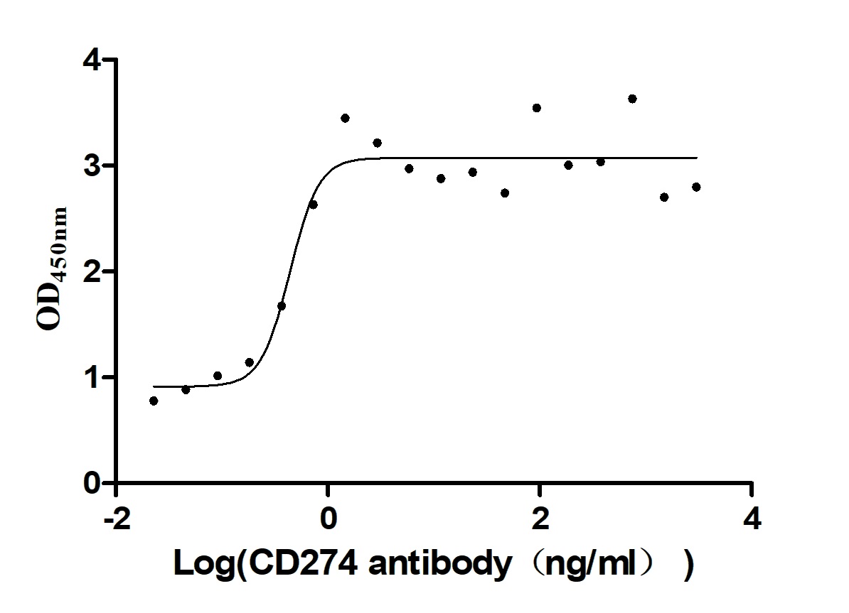 The Human Programmed cell death 1 ligand 1 (CD274) is a protein that participates in the adaptative immune response and the cell surface receptor pathway. This protein is the ligand for the inhibitory receptor PDCD1/PD-1 that regulates the activity of T-cells and limits their response. This recombinant protein is prepared by the expression of the 19-238aa region of the human CD274 in mammalian cells.It was fused on the C-terminus with a TEV linker and an immunoglobulin Fc domain tag for purification and immobilization purposes. The expressed protein has a molecular weight of 52.7 kDa. This product has a purity higher than 95%, as measured by SDS-PAGE. Its EC50 for the binding with human PD-L1 protein determined by a functional ELISA is 1.252-1.653 ng/mL. The final product has low levels of endotoxin as determined by LAL method. This recombinant protein could be used in cancer research as its increased expression in tumors promotes immune evasion and tumor cell growth by suppressing T-cell activity.Therefore, it becomes a target for the anti-PD-L1 pathway immunomodulation cancer therapy.
