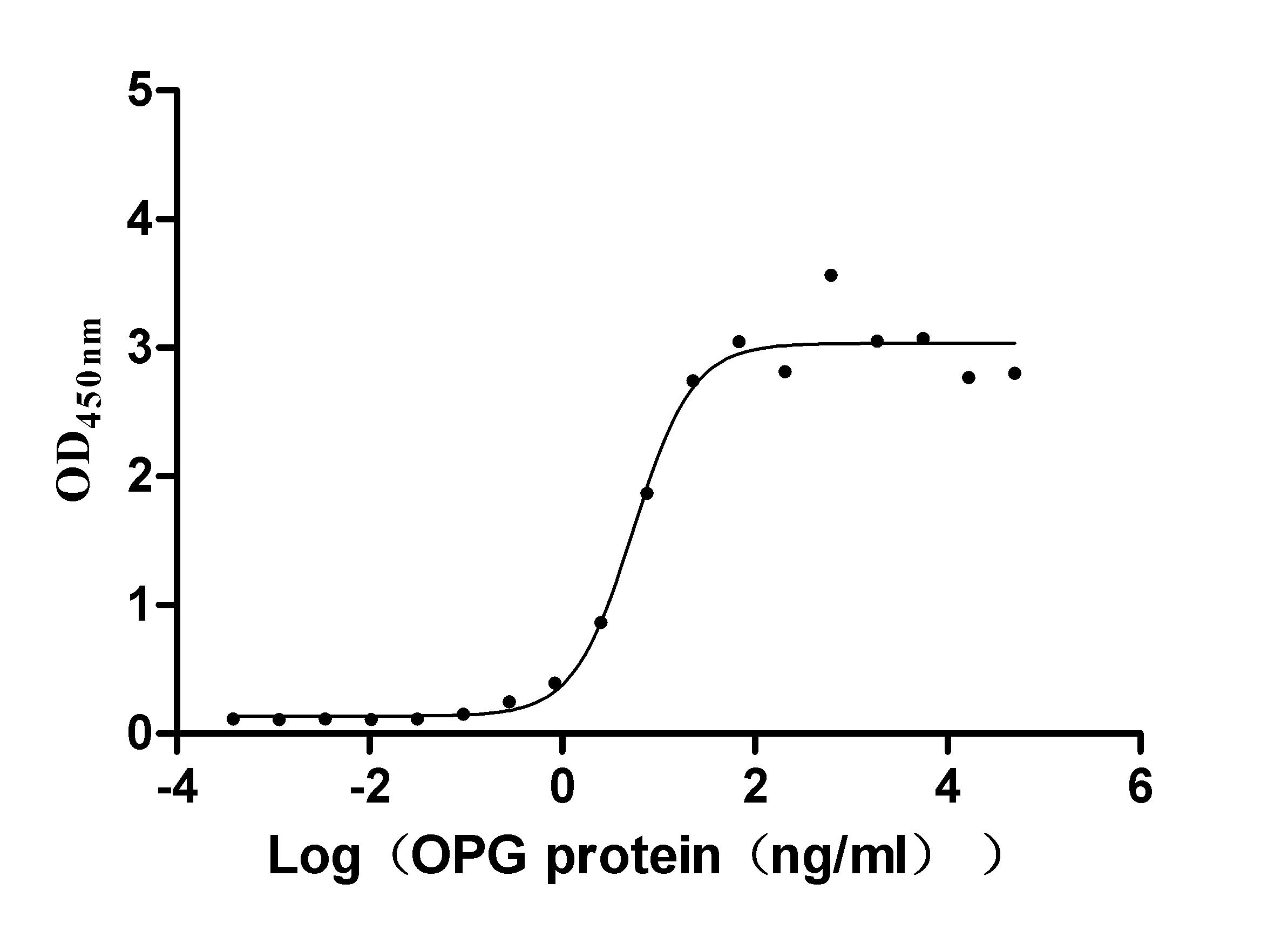 The recombinant human TNFRSF11B is expressed from mammalian cells and fused with a hFc-Flag-tag at the C-terminus. It contains amino acid residues 22-401 of the human TNFRSF11B protein. Its protein length covers the full length of the mature TNFRSF11B protein. The purity of this TNFRSF11B protein is greater than 93.6% determined by SDS-PAGE. The endotoxin content of recombinant TNFRSF11B protein is less than 1.0 EU/ug measured by the LAL method. Importantly, it has been validated to be active. In the functional ELISA, immobilized TNFSF11 can bind to this human TNFRSF11B, with the EC50 of 2.651-7.646 ng/ml. And it is in stock now.