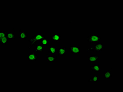 Immunofluorescence staining of Hela cells (treated with 50mM sodium 3-hydroxybutyrate for 72h) with CSB-PA010403OA120bhbHU at 1:10, counter-stained with DAPI. The cells were fixed in 4% formaldehyde, permeabilized using 0.2% Triton X-100 and blocked in 10% normal Goat Serum. The cells were then incubated with the antibody overnight at 4°C. The secondary antibody was Alexa Fluor 488-congugated AffiniPure Goat Anti-Rabbit IgG(H+L).