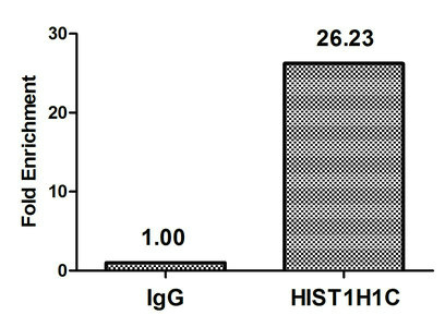 Chromatin Immunoprecipitation Hela (106, treated with 30mM sodium butyrate for 4h) were treated with Micrococcal Nuclease, sonicated, and immunoprecipitated with 5µg anti-HIST1H1C (CSB-PA010378OA116hibHU) or a control normal rabbit IgG. The resulting ChIP DNA was quantified using real-time PCR with primers against the β-Globin promoter.