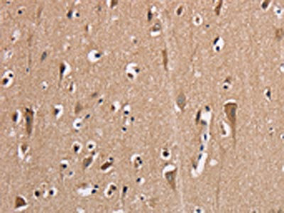 The image on the left is immunohistochemistry of paraffin-embedded Human brain tissue using CSB-PA798772(AAAS Antibody) at dilution 1/20, on the right is treated with fusion protein. (Original magnification: ×200)