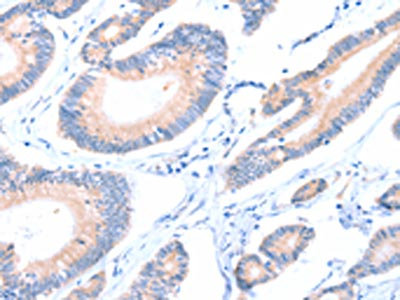 The image on the left is immunohistochemistry of paraffin-embedded Human colon cancer tissue using CSB-PA786632(AADACL2 Antibody) at dilution 1/25, on the right is treated with fusion protein. (Original magnification: ×200)