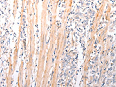 The image on the left is immunohistochemistry of paraffin-embedded Human gastric cancer tissue using CSB-PA949432(ABCA2 Antibody) at dilution 1/25, on the right is treated with synthetic peptide. (Original magnification: ×200)