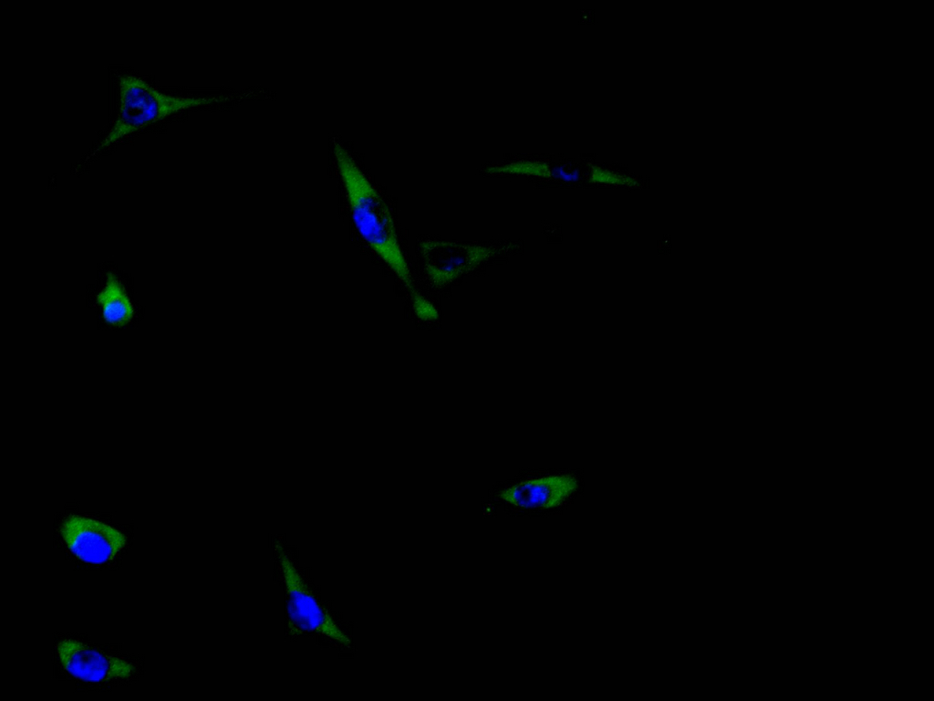 Immunofluorescence staining of MCF-7 cell with CSB-PA827811 at 1:30, counter-stained with DAPI. The cells were fixed in 4% formaldehyde and blocked in 10% normal Goat Serum. The cells were then incubated with the antibody overnight at 4C. The secondary antibody was Alexa Fluor 488-congugated AffiniPure Goat Anti-Rabbit IgG(H+L).