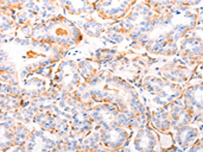 The image on the left is immunohistochemistry of paraffin-embedded Human thyroid cancer tissue using CSB-PA217707(ABCA4 Antibody) at dilution 1/30, on the right is treated with synthetic peptide. (Original magnification: ×200)