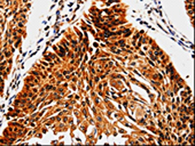 The image is immunohistochemistry of paraffin-embedded Human cervical cancer tissue using CSB-PA181054(ABCB5 Antibody) at dilution 1/10. (Original magnification: ×200)