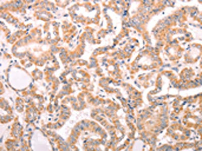 The image on the left is immunohistochemistry of paraffin-embedded Human thyroid cancer tissue using CSB-PA931399(ABCF2 Antibody) at dilution 1/25, on the right is treated with fusion protein. (Original magnification: ×200)