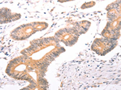The image on the left is immunohistochemistry of paraffin-embedded Human colon cancer tissue using CSB-PA931399(ABCF2 Antibody) at dilution 1/25, on the right is treated with fusion protein. (Original magnification: ×200)