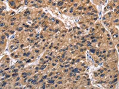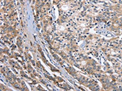 The image on the left is immunohistochemistry of paraffin-embedded Human liver cancer tissue using CSB-PA729627(ABI3BP Antibody) at dilution 1/50, on the right is treated with fusion protein. (Original magnification: ×200)