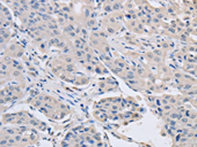 The image on the left is immunohistochemistry of paraffin-embedded Human breast cancer tissue using CSB-PA914946(ABLIM1 Antibody) at dilution 1/30, on the right is treated with fusion protein. (Original magnification: ×200)