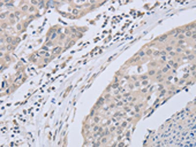 The image on the left is immunohistochemistry of paraffin-embedded Human lung cancer tissue using CSB-PA914946(ABLIM1 Antibody) at dilution 1/30, on the right is treated with fusion protein. (Original magnification: ×200)