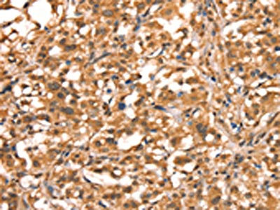 The image on the left is immunohistochemistry of paraffin-embedded Human thyroid cancer tissue using CSB-PA045809(ACADVL Antibody) at dilution 1/15, on the right is treated with synthetic peptide. (Original magnification: ×200)
