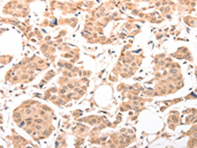 The image on the left is immunohistochemistry of paraffin-embedded Human breast cancer tissue using CSB-PA911950(ACIN1 Antibody) at dilution 1/30, on the right is treated with synthetic peptide. (Original magnification: ×200)