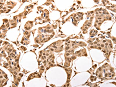 The image on the left is immunohistochemistry of paraffin-embedded Human breast cancer tissue using CSB-PA073168(ACO2 Antibody) at dilution 1/30, on the right is treated with synthetic peptide. (Original magnification: ×200)