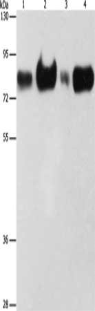 Gel: 8%SDS-PAGE, Lysate: 40 μg, Lane 1-4: Hepg2 cells, hela cells, 293T cells, human fetal kidney tissue, Primary antibody: CSB-PA289963(ACSL4 Antibody) at dilution 1/225, Secondary antibody: Goat anti rabbit IgG at 1/8000 dilution, Exposure time: 15 seconds