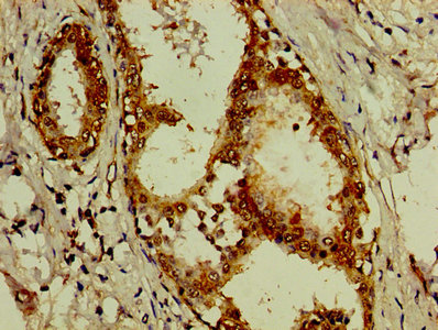 IHC image of CSB-PA00814A0Rb diluted at 1:200 and staining in paraffin-embedded human breast cancer performed on a Leica BondTM system. After dewaxing and hydration, antigen retrieval was mediated by high pressure in a citrate buffer (pH 6.0). Section was blocked with 10% normal goat serum 30min at RT. Then primary antibody (1% BSA) was incubated at 4°C overnight. The primary is detected by a biotinylated secondary antibody and visualized using an HRP conjugated SP system.