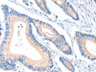 The image on the left is immunohistochemistry of paraffin-embedded Human colon cancer tissue using CSB-PA918458(ACTR1A Antibody) at dilution 1/10, on the right is treated with fusion protein. (Original magnification: ×200)
