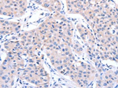 The image on the left is immunohistochemistry of paraffin-embedded Human gastic cancer tissue using CSB-PA271275(ACTR3B Antibody) at dilution 1/15, on the right is treated with fusion protein. (Original magnification: ×200)