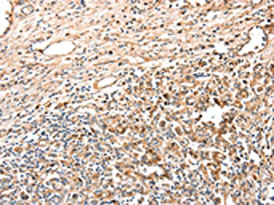 The image on the left is immunohistochemistry of paraffin-embedded Human gastric cancer tissue using CSB-PA776767(ADA Antibody) at dilution 1/15, on the right is treated with fusion protein. (Original magnification: ×200)