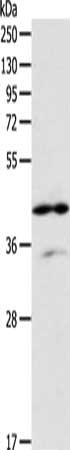 Gel: 10%SDS-PAGE, Lysate: 40 μg, Lane: Raji cells, Primary antibody: CSB-PA776767(ADA Antibody) at dilution 1/200, Secondary antibody: Goat anti rabbit IgG at 1/8000 dilution, Exposure time: 30 seconds