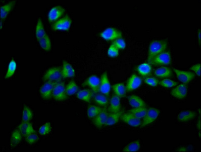 Immunofluorescence staining of Hela cells with CSB-PA891722LA01HU at 1:166, counter-stained with DAPI. The cells were fixed in 4% formaldehyde, permeabilized using 0.2% Triton X-100 and blocked in 10% normal Goat Serum. The cells were then incubated with the antibody overnight at 4°C. The secondary antibody was Alexa Fluor 488-congugated AffiniPure Goat Anti-Rabbit IgG(H+L).