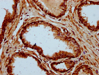 IHC image of CSB-PA891722LA01HU diluted at 1:500 and staining in paraffin-embedded human prostate cancer performed on a Leica BondTM system. After dewaxing and hydration, antigen retrieval was mediated by high pressure in a citrate buffer (pH 6.0). Section was blocked with 10% normal goat serum 30min at RT. Then primary antibody (1% BSA) was incubated at 4°C overnight. The primary is detected by a biotinylated secondary antibody and visualized using an HRP conjugated SP system.