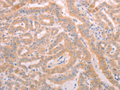 The image on the left is immunohistochemistry of paraffin-embedded Human thyroid cancer tissue using CSB-PA798156(ADAMTS10 Antibody) at dilution 1/20, on the right is treated with synthetic peptide. (Original magnification: ×200)
