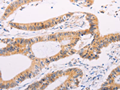 The image on the left is immunohistochemistry of paraffin-embedded Human colon cancer tissue using CSB-PA557372(ADAMTS17 Antibody) at dilution 1/60, on the right is treated with synthetic peptide. (Original magnification: ×200)