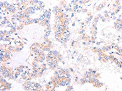 The image on the left is immunohistochemistry of paraffin-embedded Human thyroid cancer tissue using CSB-PA708534(ADAP1 Antibody) at dilution 1/40, on the right is treated with fusion protein. (Original magnification: ×200)