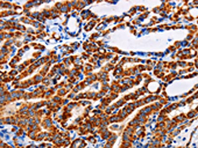 The image on the left is immunohistochemistry of paraffin-embedded Human thyroid cancer tissue using CSB-PA235954(ADH1A Antibody) at dilution 1/25, on the right is treated with fusion protein. (Original magnification: ×200)
