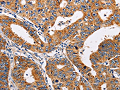 The image on the left is immunohistochemistry of paraffin-embedded Human gastic cancer tissue using CSB-PA235954(ADH1A Antibody) at dilution 1/25, on the right is treated with fusion protein. (Original magnification: ×200)