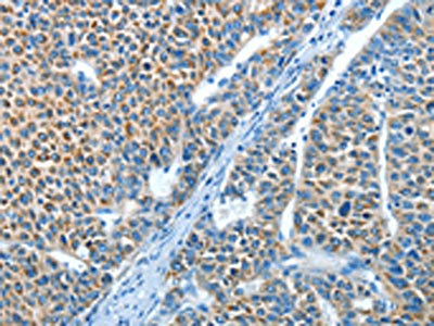 The image on the left is immunohistochemistry of paraffin-embedded Human liver cancer tissue using CSB-PA698673(ADRA1B Antibody) at dilution 1/25, on the right is treated with synthetic peptide. (Original magnification: ×200)