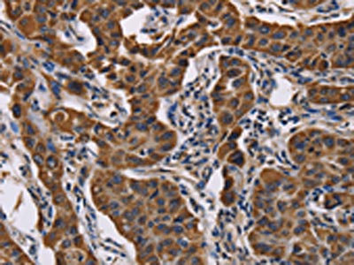 The image on the left is immunohistochemistry of paraffin-embedded Human lung cancer tissue using CSB-PA913546(ADRBK2 Antibody) at dilution 1/50, on the right is treated with fusion protein. (Original magnification: ×200)