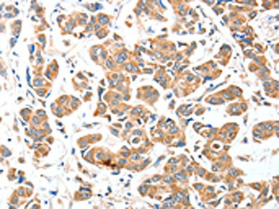 The image on the left is immunohistochemistry of paraffin-embedded Human breast cancer tissue using CSB-PA156662(AEBP2 Antibody) at dilution 1/25, on the right is treated with fusion protein. (Original magnification: ×200)