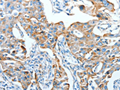 The image on the left is immunohistochemistry of paraffin-embedded Human lung cancer tissue using CSB-PA098902(AFAP1 Antibody) at dilution 1/20, on the right is treated with fusion protein. (Original magnification: ×200)