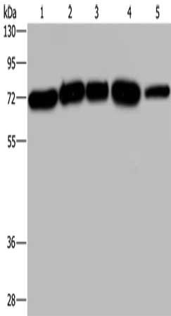 Gel: 8%SDS-PAGE, Lysate: 40 μg, Lane 1-5: A172 cells, Hela cells, 293T cells, K562 cells, human testis tissue, Primary antibody: CSB-PA030856(AGFG1 Antibody) at dilution 1/533, Secondary antibody: Goat anti rabbit IgG at 1/8000 dilution, Exposure time: 40 seconds