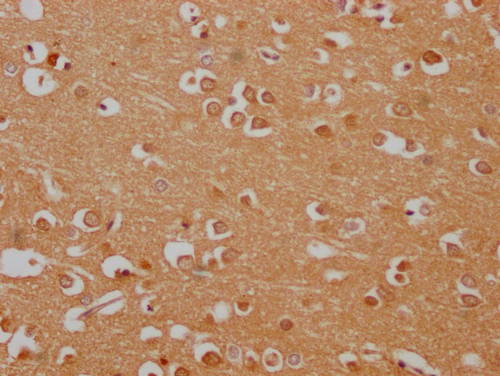 IHC image of CSB-PA875700LA01HU diluted at 1:100 and staining in paraffin-embedded human brain tissue performed on a Leica BondTM system. After dewaxing and hydration, antigen retrieval was mediated by high pressure in a citrate buffer (pH 6.0). Section was blocked with 10% normal goat serum 30min at RT. Then primary antibody (1% BSA) was incubated at 4°C overnight. The primary is detected by a Goat anti-rabbit polymer IgG labeled by HRP and visualized using 0.05% DAB.