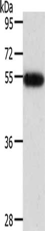 Gel: 10%SDS-PAGE, Lysate: 40 μg, Lane: Human liver cancer tissue, Primary antibody: CSB-PA959270(AGT Antibody) at dilution 1/600, Secondary antibody: Goat anti rabbit IgG at 1/8000 dilution, Exposure time: 5 minutes