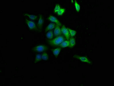 Immunofluorescence staining of HepG2 cells with CSB-PA001474HA01HU at 1:133, counter-stained with DAPI. The cells were fixed in 4% formaldehyde, permeabilized using 0.2% Triton X-100 and blocked in 10% normal Goat Serum. The cells were then incubated with the antibody overnight at 4°C. The secondary antibody was Alexa Fluor 488-congugated AffiniPure Goat Anti-Rabbit IgG(H+L).