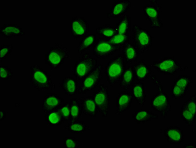Immunofluorescence staining of A549 cells with CSB-PA812872LA01HU at 1:133, counter-stained with DAPI. The cells were fixed in 4% formaldehyde, permeabilized using 0.2% Triton X-100 and blocked in 10% normal Goat Serum. The cells were then incubated with the antibody overnight at 4°C. The secondary antibody was Alexa Fluor 488-congugated AffiniPure Goat Anti-Rabbit IgG(H+L).